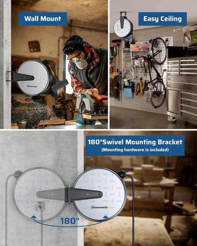 [Easy to Install] Equipped with 2 mounting screws and 1 bracket, this retractable power cord reel is easy to assemble with few minutes; the spin mount bracket allows the cord reel to rotate smoothly up to 180 degrees, ideal for suspending from your garage/ workshop roof or fastening onto a wall