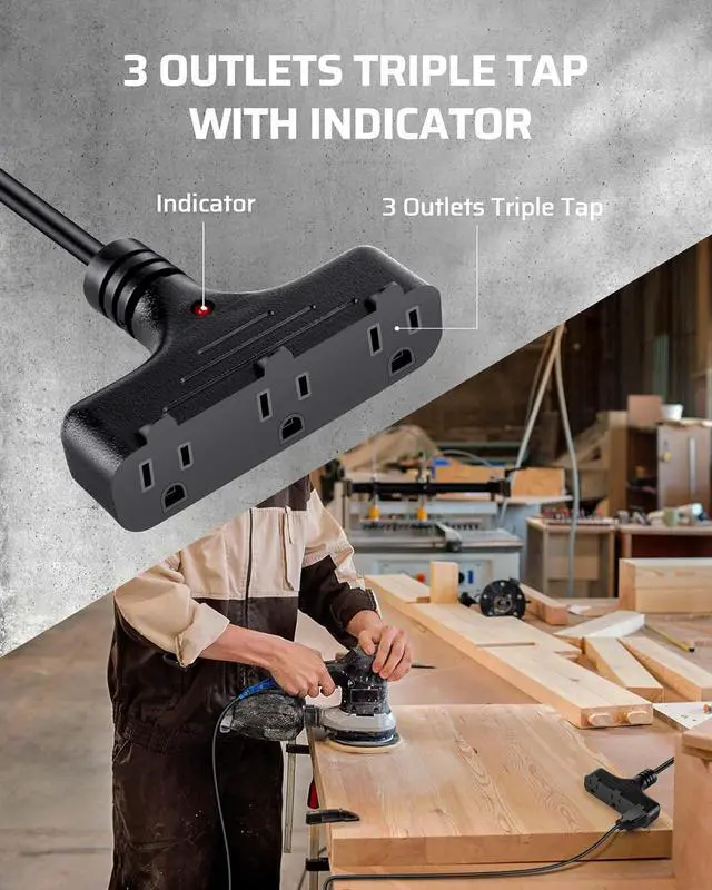 [3 Grounded Outlets] With triple tap pigtail and each jack is designed with enough space reserved between them, the drop cord reel can power up multiple devices simultaneously and make the most of your power strips and wall sockets; the handy indicator light lets you know when the cord is ready to use
