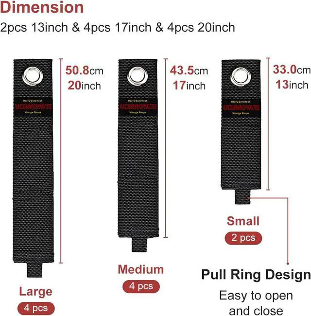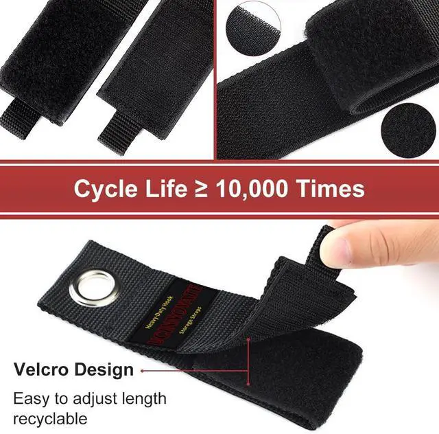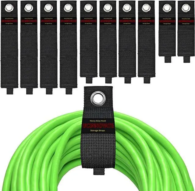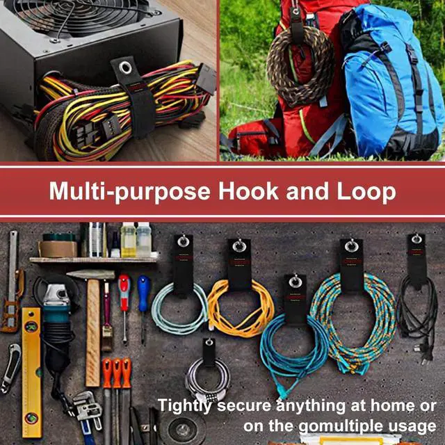 Heavy Duty Material - Made with heavy-duty weatherproof polypropylene, industrial strength hook and loop, and a rust-resistant grommet, there are built to lastindoors or out. Can hold up to 50 lbs / 22kg (10-28 sizes) on garage racks, easy to hang indoor or outdoor extension cords, large appliance cables and cords, network wires and generator cords, electric power cords and corded tools, washer hoses and garden and pool hoses, air and vacuum hoses, and other large hoses or rope, etc