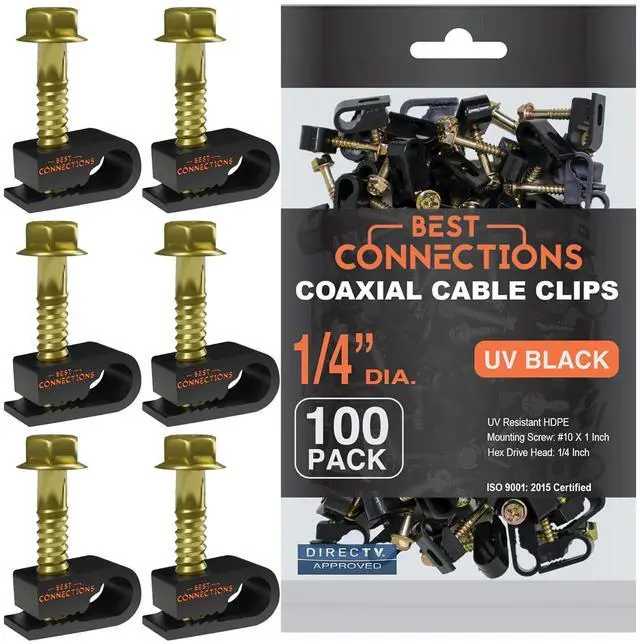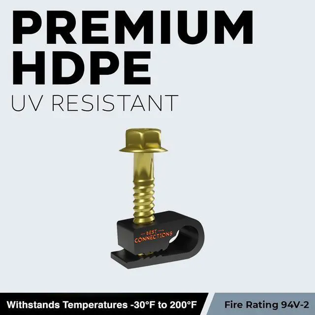 HIGH QUALITY MATERIAL Expertly crafted with high-quality, stabilized plastic and pre-inserted screws, our screw-in cable clips are highly resistant to breakage. Made of premium-grade UV protected High Density Polyethylene (HDPE), these clips offer excellent properties such as high impact strength and stiffness, outstanding formability, and superior performance in both high and low-temperature conditions. Approved by AT&T, DIRECTV and VIASAT.