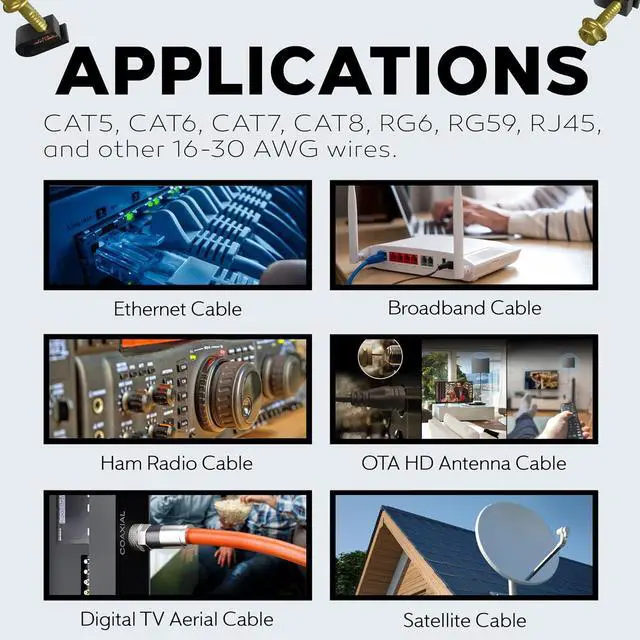 WIDE APPLICATIONS These cable clips are suitable for a wide range of applications, including home, office, and electrical uses, and are compatible with various wire types such as ethernet, electrical, satellite dish, coaxial, CAT5, CAT6, CAT7, CAT8, RG6, RG59, RJ45, and other 16-30 AWG wires. These wall cable holders also assist in keeping the room neat and organized.