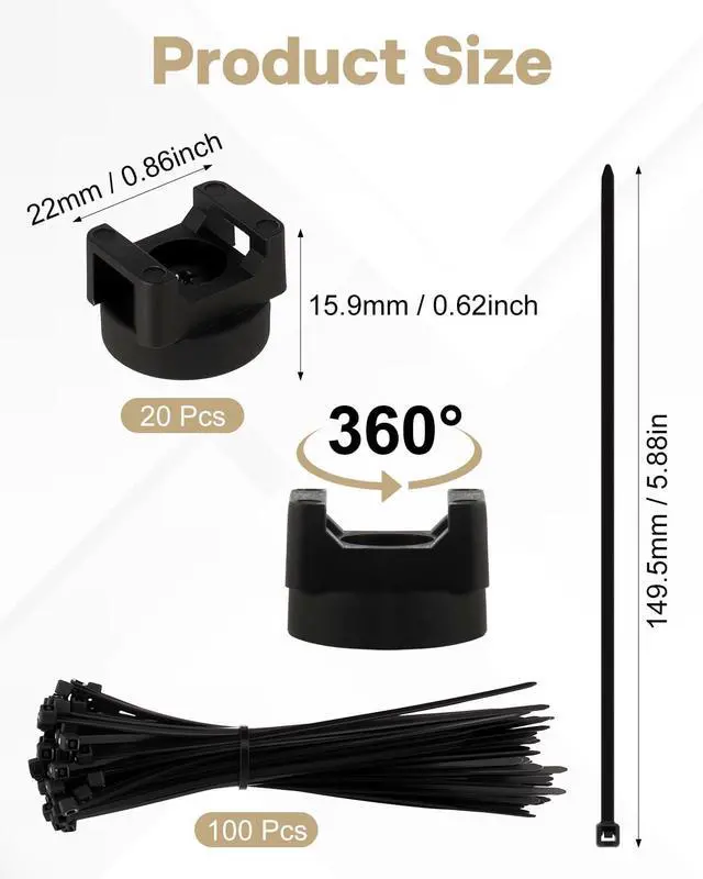 Package Contents: Each set includes 20 pcs 20mm magnetic cable tie holders and 100 pcs zip ties, meeting the cable organization needs of homes, offices, or cars. It provides an efficient and tidy solution that is both convenient and practical