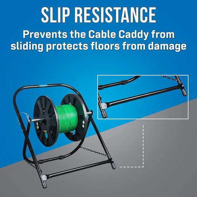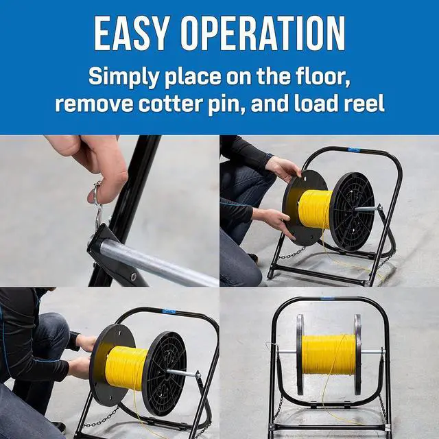 EASY OPERATION: Easy to set up by just placing Cable Caddy on floor, removing cotter pin, and loading reel. Able to firmly hold cable reels weighing up to 100 lb and measuring up to 20 diameter and 17 height