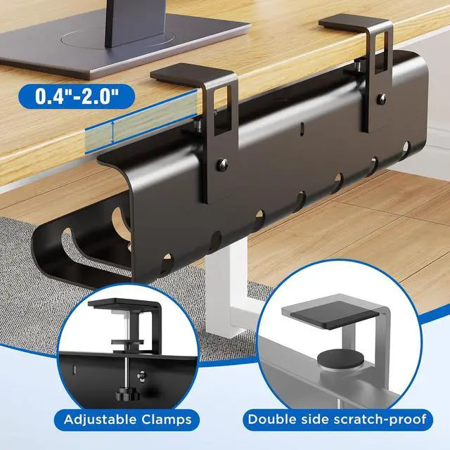No-Drill Installation & Universal Compatibility Achieve seamless cable management under desk without drilling or damaging your workspace. Our under desk cable management tray features adjustable clamps ( 0.4 " -2" thickness) that securely attach to wood, glass, metal or standing desks. Equipped with non-slip rubber pads to protect the desk from scratches, supporting flexible inward/outward position adjustment for personalized use.
