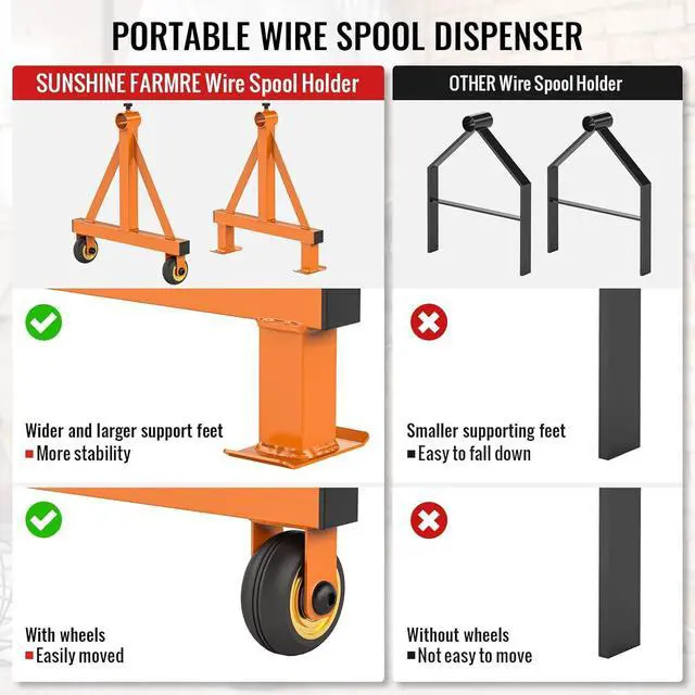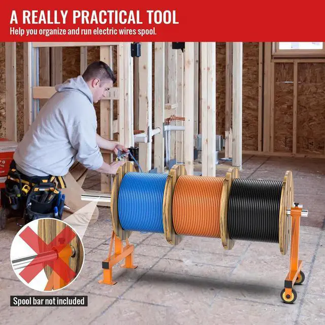 Work Efficiency: The wire spool rack is equipped with two wheels to make the wire spools easy to pick up and move. Match the spool bar to your needs (package not include spool bar) to hold and pull multiple spools of wire. Use our wire caddy dispenser can prevent you from tripping hazards on wires while you work, making your work easier.