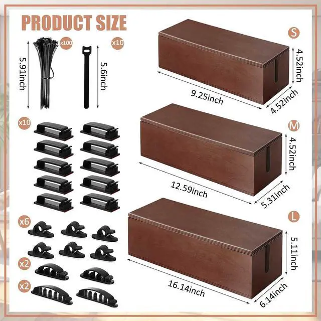 Optimize Your Cable Organization: featuring 3 different sizes of power strip boxes, with the dimensions of about 16.14 x 6.14 x 5.11 inches, about 12.59 x 5.31 x 4.52 inches, and about 9.25 x 4.52 x 4.52 inches respectively, we' ve made it easy to shield your cable chaos, whether you want to manage a few charging cables or a full power strip, our boxes got you covered, it' s a smart, safe solution for keeping your cables well organized
