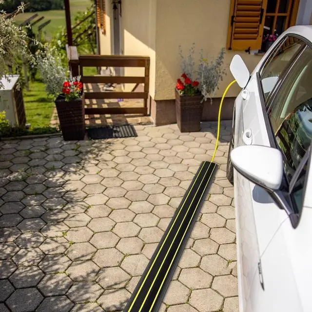 Heavy Duty & Quality Material --- Floor cable cover made of 3 mm thick PVC material, safety, odorless. 6 ft floor cord cover weighs almost 4 pounds, heavy duty, supplied coiled, can uncoil to lay flat, doesn' t curl, attaches to the ground easily, no need to apply adhesive tapes to secure to floor.