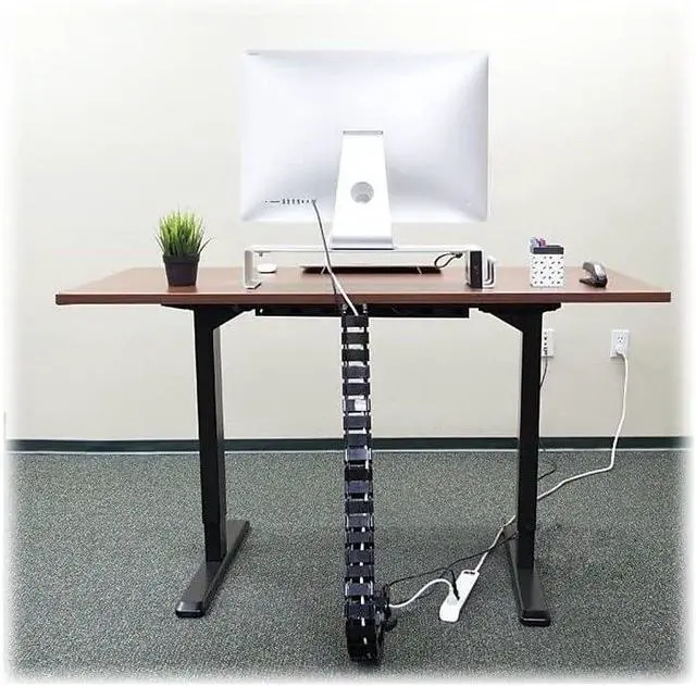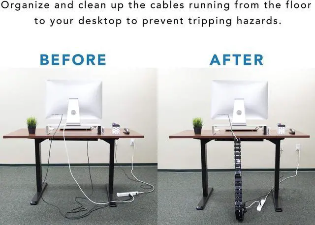 DESK TO FLOOR CABLE ORGANIZER: Attaches to the back of your desk, designed to protect and organize AV and power cords. Offers protection from wire chewing pets or cable pulling children. Great for height adjustable or stationary desk systems.
