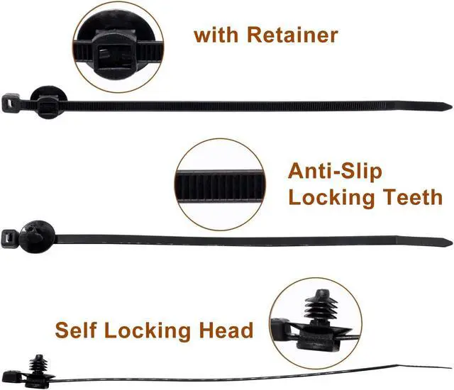 Application: Nylon Push Mount Cable Zip Tie Good for anchoring wires, cables, and small hoses. A must have when working on cars, and holds wires up and out of the way. Can be used for many different things. Exactly what you need for auto wiring harnesses