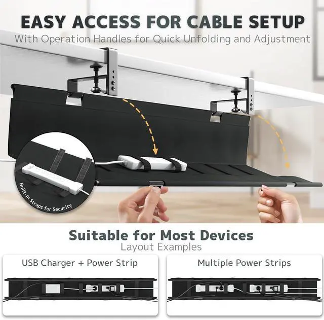 Easy Access & Customizable Layout: Fully unfold the tray to add or rearrange cables effortlessly. Built-in cable ties fix each cord separately, preventing tangles and making future upgrades a breeze