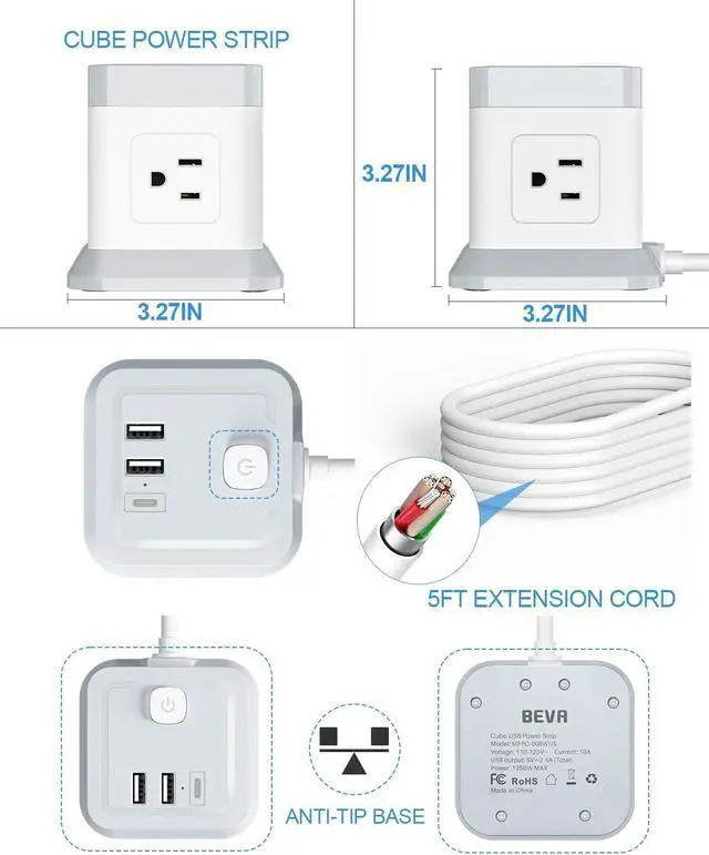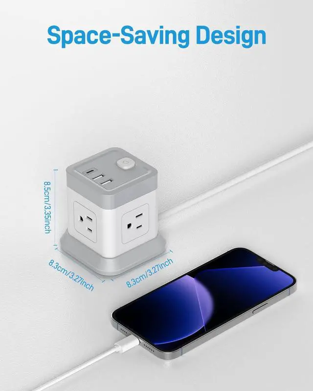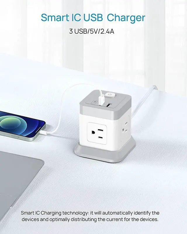 7 in 1 Power Strip CubeThe USB tower is equipped with 3 USB (1 USB C) charging ports and 4 AC outlets in different directions, Provide power for up to 7 devices at the same time and all side outlet is designed for large adapters to charge without blocking each other, save your space and keep your desktop organized. You can charge your phone, lamp, laptop and other devices together.