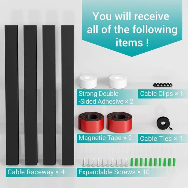 COMPLETE KIT - Includes 4 cable cover raceways (15.7"x1.4"x1.2" each), 62.8" magnetic accessories, double sided adhesive tape, screws. Full Cable Management solution