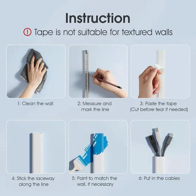 Easy and quick tool free installation: The tv wire hider for wall is equipped with a strong adhesive backing that is ready to tear. You can experience strong lasting power after installation, stopping the whole wire hider from shifting or falling, and can provide enough load-bearing support for 3-5 wires. Pre-position the wall cord hider to avoid wall damage from re-pasting