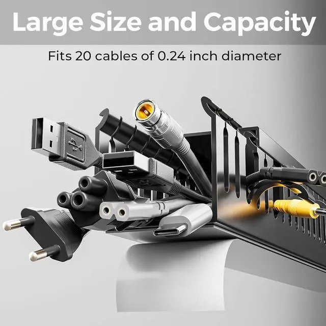Strong adhesive & hassle-free installation: A high-tack adhesive strip on the back enables tool-free mounting of the cable organizer, securing firmly to walls/cabinets without residue. The oversized desk cord management with side openings centralizes Ethernet/HDMI/power cables and hides clutter