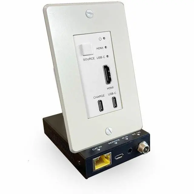 Comprehensives CHE-HDWP85UD is a 2x1 switcher and CAT transmitter with HDMI and USB-C inputs. It features a US one-gang enclosure for Decora-style wall plate openings and supports video resolutions up to 4K/UHD@60Hz 4:4:4. The CAT6 output can extend video transmission distance up to 164ft. The CHE-HDWP85UD is remotely powered by the receiver or other CAT-equipped devices via POC.