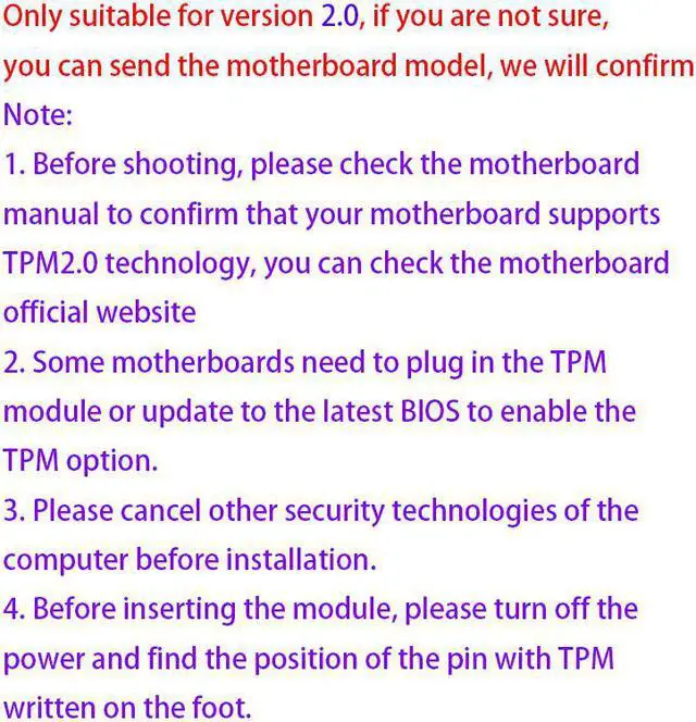 Module Note: Please note these are not universal, please check the module required by your particular motherboard. Please also note that not all motherboards can support TPM 2.0 Before you take the order, please check the motherboard manual to confirm that your motherboard supports TPM 2.0 technology. You can check or consult on the motherboard's official website. Some motherboards need to plug in the TPM module or update to the latest BIOS to enable the TPM option. Please cancel other computer security technologies before installation.