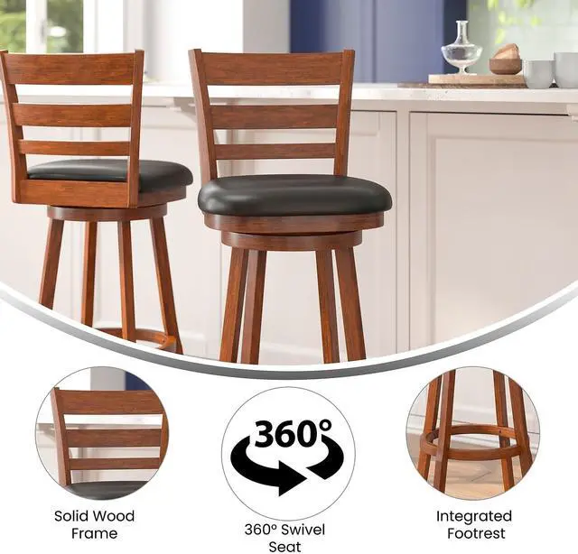 Traditional, on-trend style is available to any home or business with this upholstered wooden bar height swivel stool. The classic ladderback design and soft and durable LeatherSoft upholstered seat blend old school charm with a fresh outlook. The integrated footrest provides pressure relief for your legs and the sturdy, solid wood frame holds up to 300 lbs. static weight. The 360° swivel seat makes for easy conversation and movement while the fixed floor glides prevent damage to hard flooring surfaces. Cleanup is easily achieved with a dry cloth and assembly is a breeze with the included tools and step-by-step instructions. Also available in counter height, this dining stool would make a perfect addition to any commercial or residential space.
