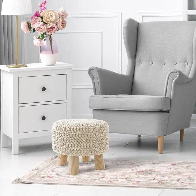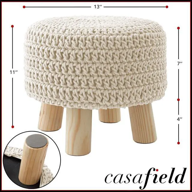 Pouf Ottoman Footstool, 13" Round x 11" High, Hand-Knitted Cotton Footrest, Non-Skid Wood Legs, Boho Foot Stool for Living Room, Bedroom (Natural)
