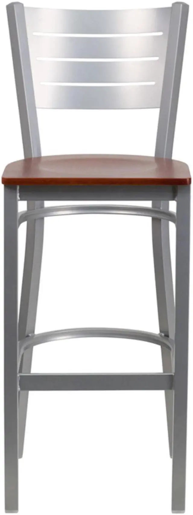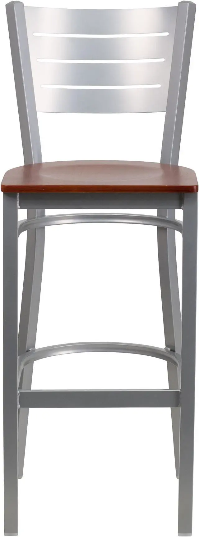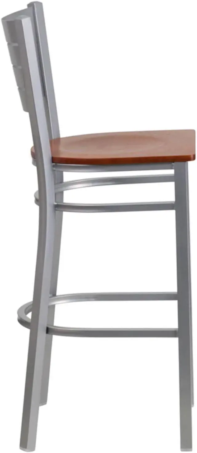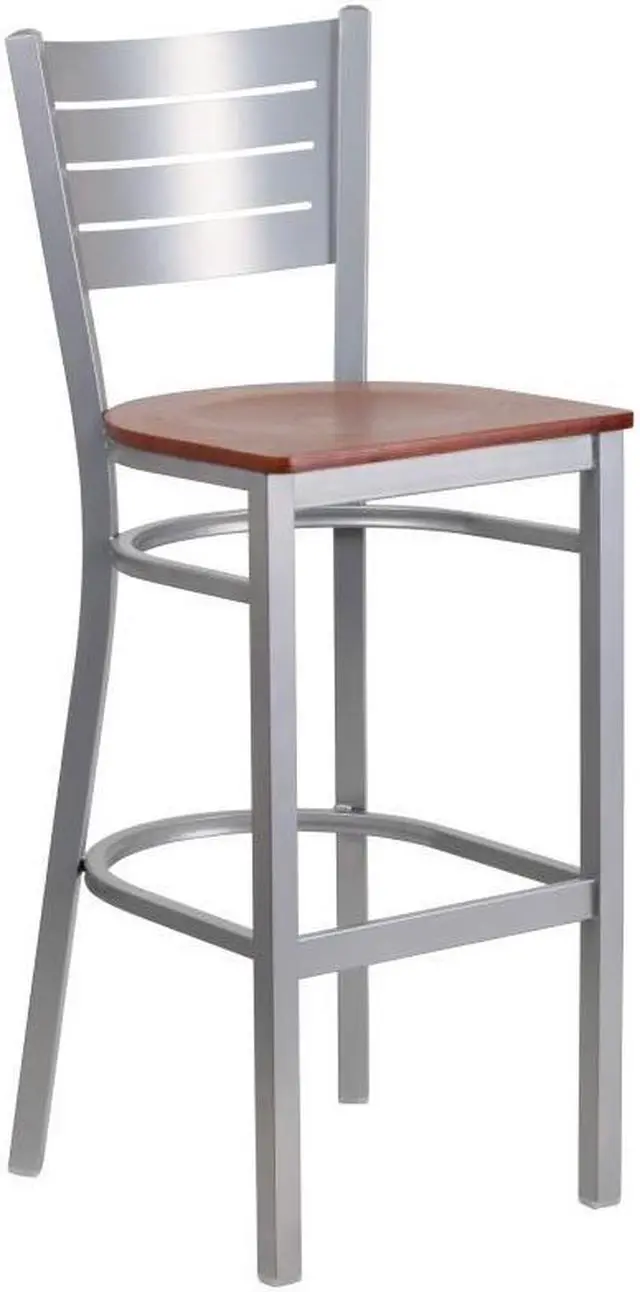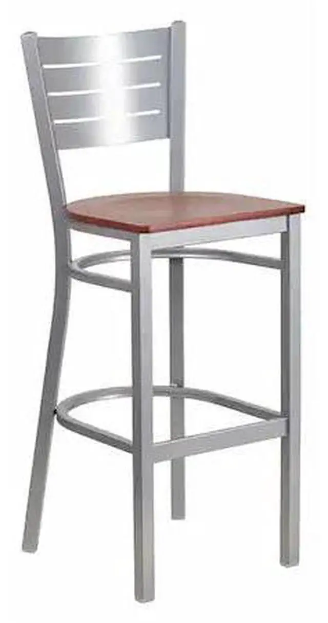 The silver slat back metal restaurant barstool will be an attractive addition to your eatery, pool hall or your bar at home. This metal barstool has a slat back design, cherry wood seat and an 18 gauge steel frame. The welded joint assembly and two curved support bars give the stool great strength and stability. The lower support bar doubles as footrest. Plastic floor glides protect your floors by sliding smoothly when you need to move the stool. The slat back metal restaurant barstool is a durable, commercial grade, restaurant barstool that also would be a great choice for use in your home.