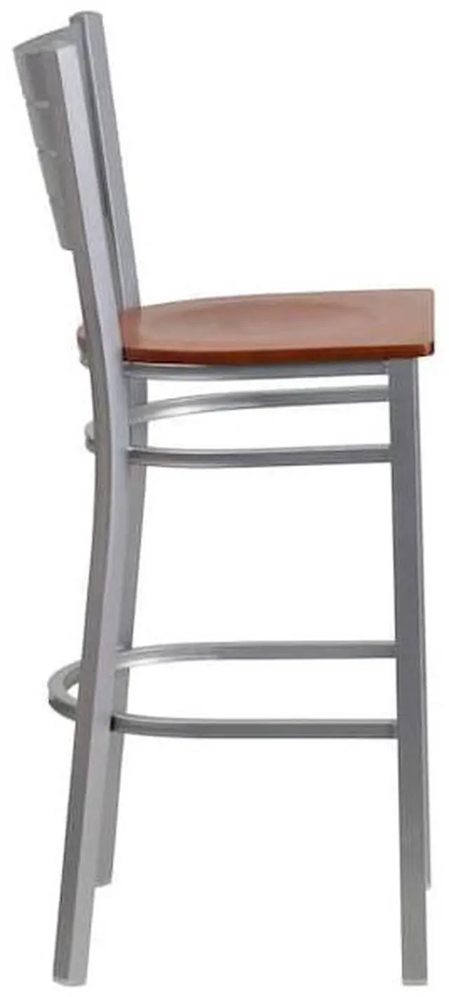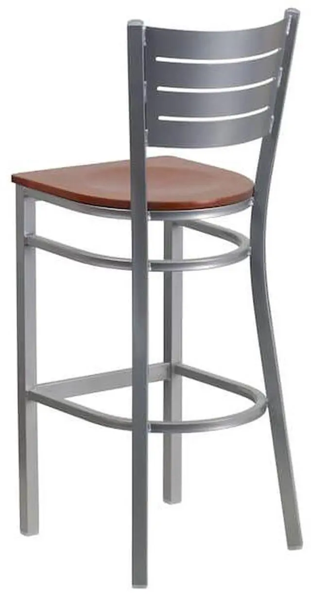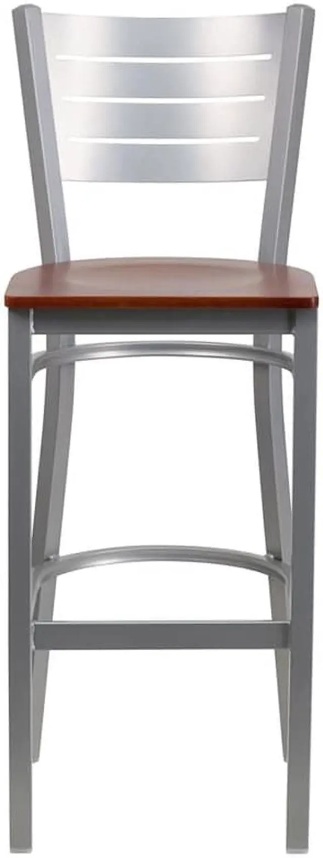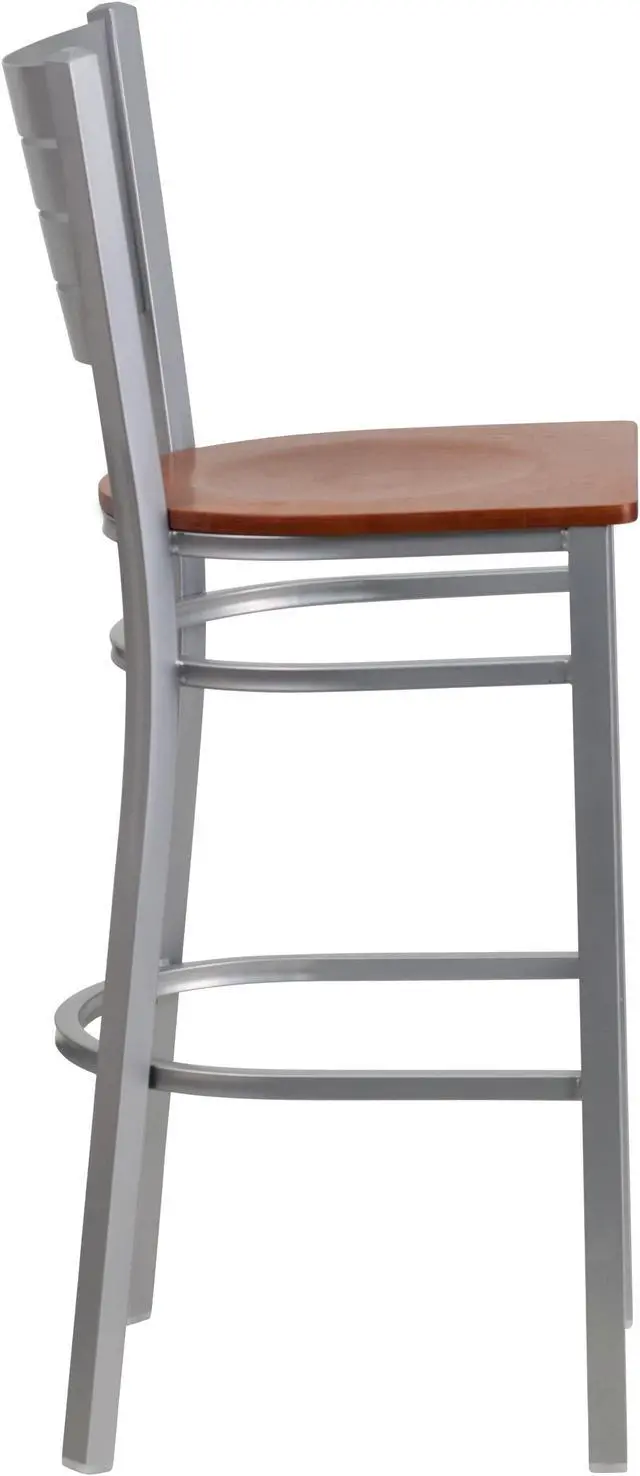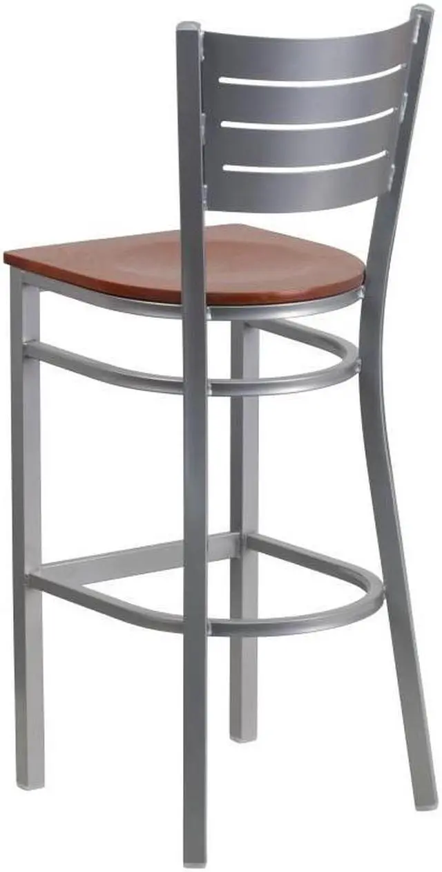 The silver slat back metal restaurant barstool will be an attractive addition to your eatery, pool hall or your bar at home. This metal barstool has a slat back design, cherry wood seat and an 18 gauge steel frame. The welded joint assembly and two curved support bars give the stool great strength and stability. The lower support bar doubles as footrest. Plastic floor glides protect your floors by sliding smoothly when you need to move the stool. The slat back metal restaurant barstool is a durable, commercial grade, restaurant barstool that also would be a great choice for use in your home.