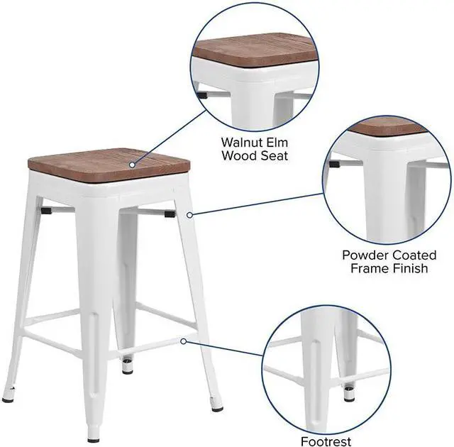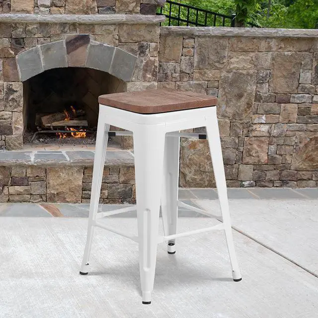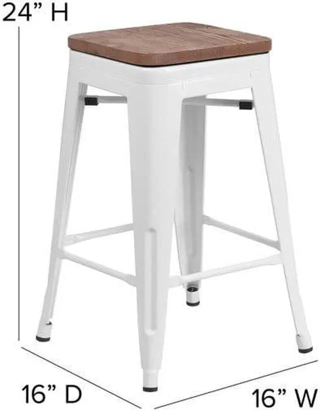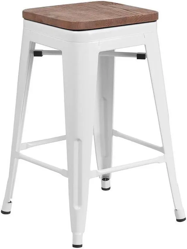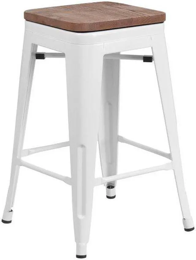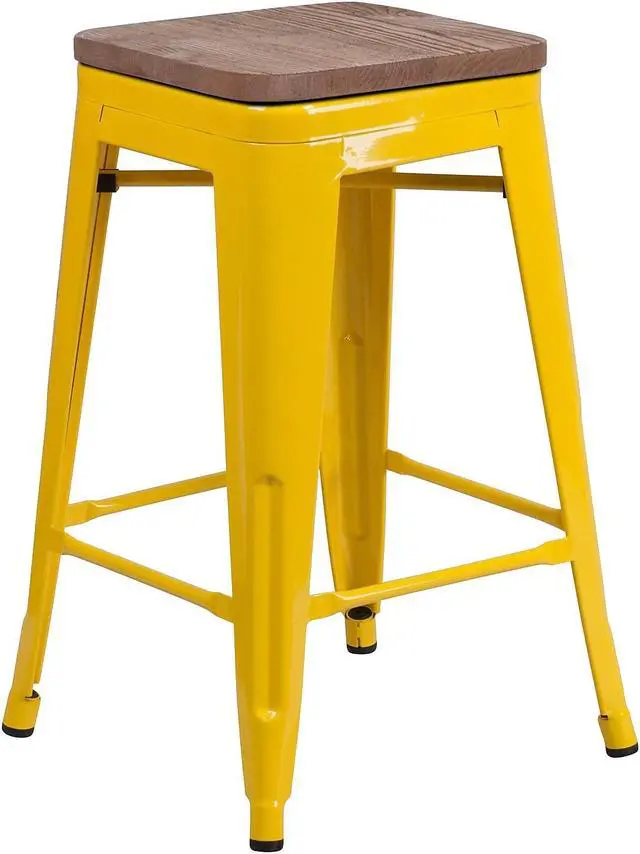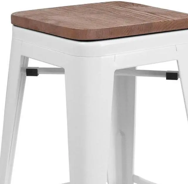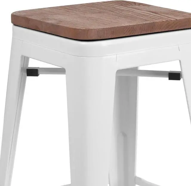 Save on space with this Backless Metal Bar Stool with wood seat. The clean lines and simple design of this square, industrial style stool will look great in your kitchen or inside your bar/restaurant. Designed to stack, this stool is an ideal choice in the restaurant industry. A cross brace underneath the seat adds extra stability and features plastic caps that prevent the finish from scratching when stacked. The lower support brace doubles as a footrest, and floor glides protect your floor by sliding smoothly when moving it. Designed for both commercial and residential use, this bar height stool will provide refreshing rustic feel with its metal and wood features.