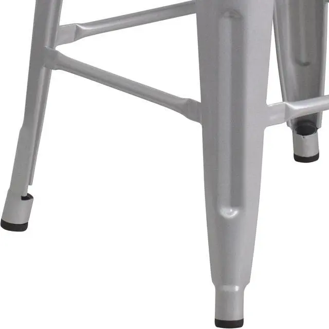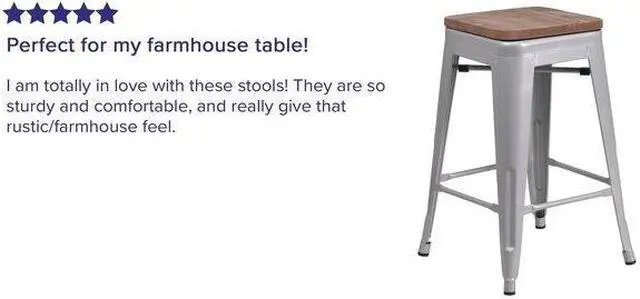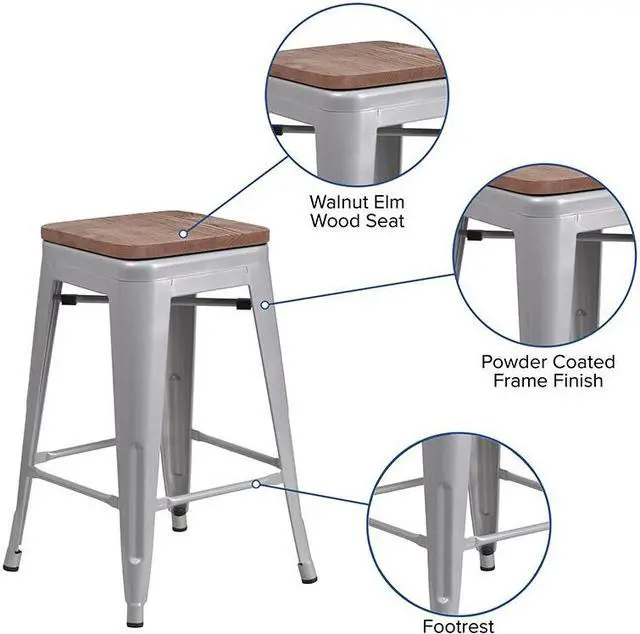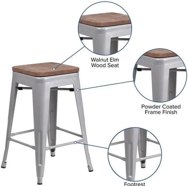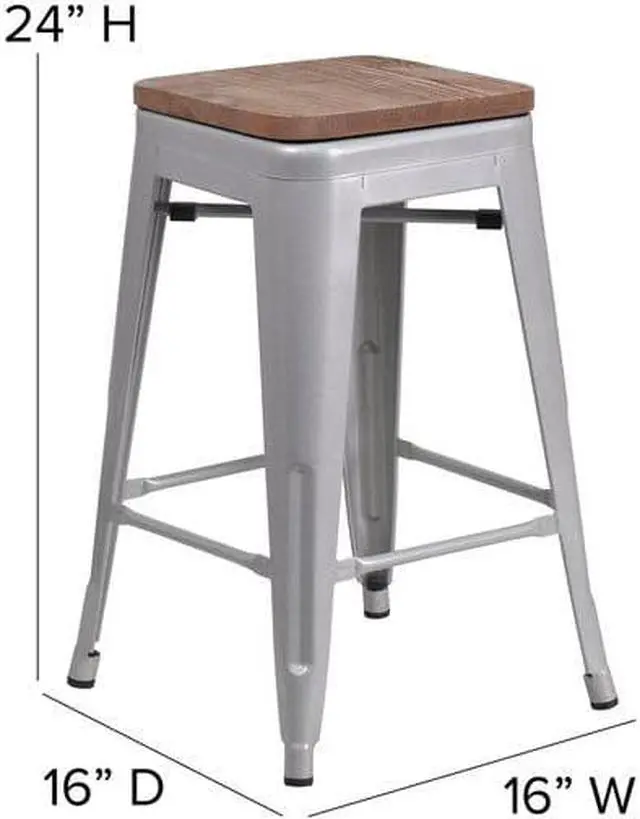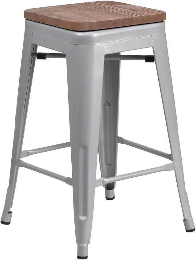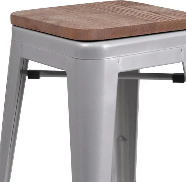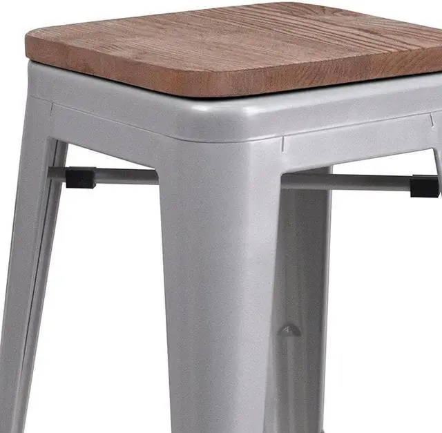 Save on space with this Backless Metal Bar Stool with wood seat. The clean lines and simple design of this square, industrial style stool will look great in your kitchen or inside your bar/restaurant. Designed to stack, this stool is an ideal choice in the restaurant industry. A cross brace underneath the seat adds extra stability and features plastic caps that prevent the finish from scratching when stacked. The lower support brace doubles as a footrest, and floor glides protect your floor by sliding smoothly when moving it. Designed for both commercial and residential use, this bar height stool will provide refreshing rustic feel with its metal and wood features.