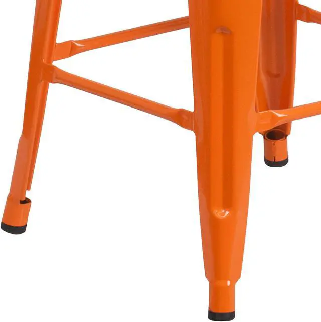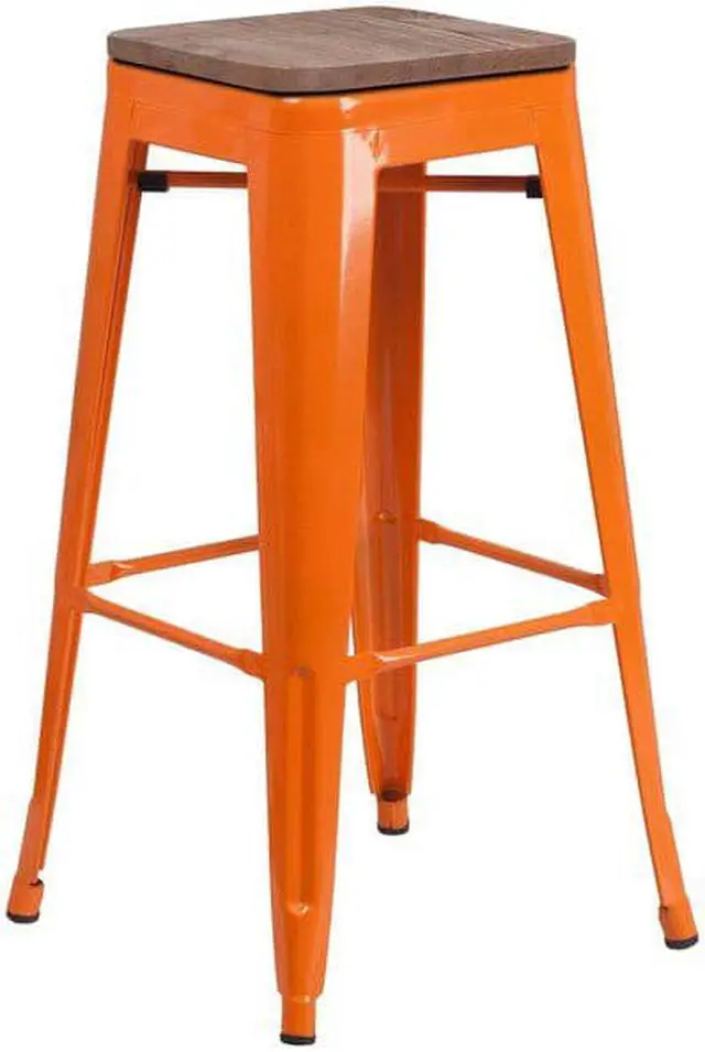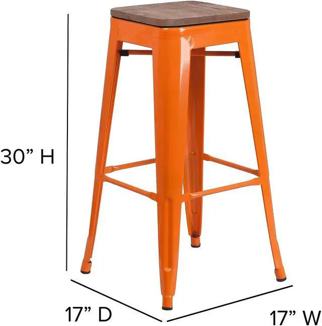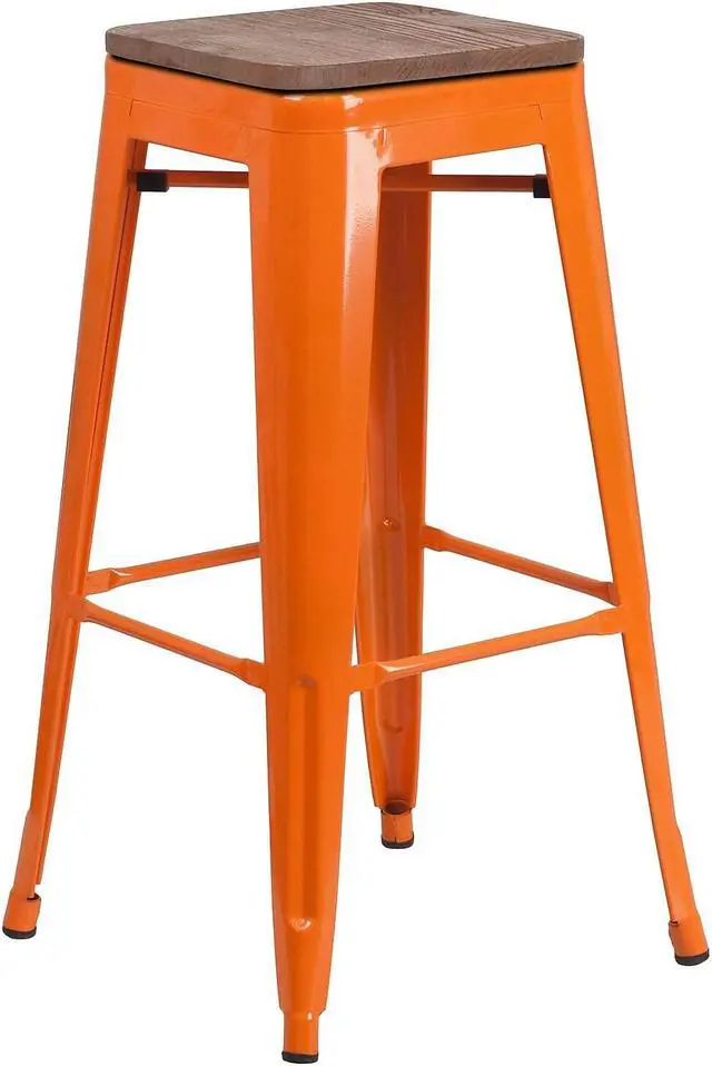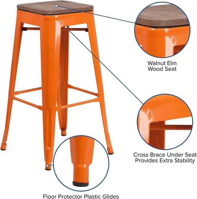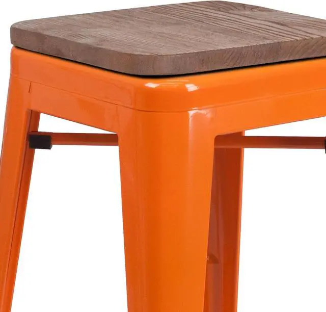 Save on space with this Backless Metal Bar Stool with wood seat. The clean lines and simple design of this square, industrial style stool will look great in your kitchen or inside your bar/restaurant. Designed to stack, this stool is an ideal choice in the restaurant industry. A cross brace underneath the seat adds extra stability and features plastic caps that prevent the finish from scratching when stacked. The lower support brace doubles as a footrest, and floor glides protect your floor by sliding smoothly when moving it. Designed for both commercial and residential use, this bar height stool will provide refreshing rustic feel with its metal and wood features.