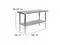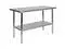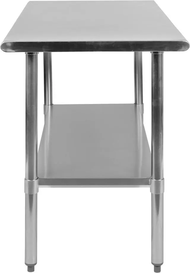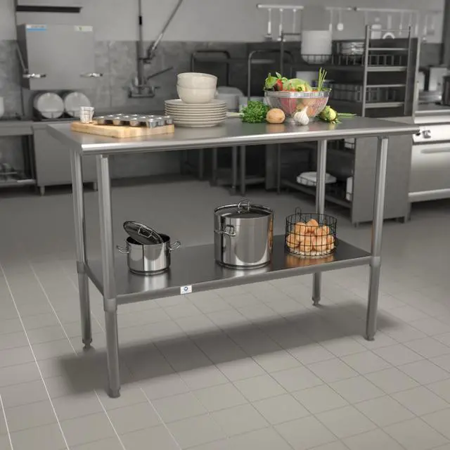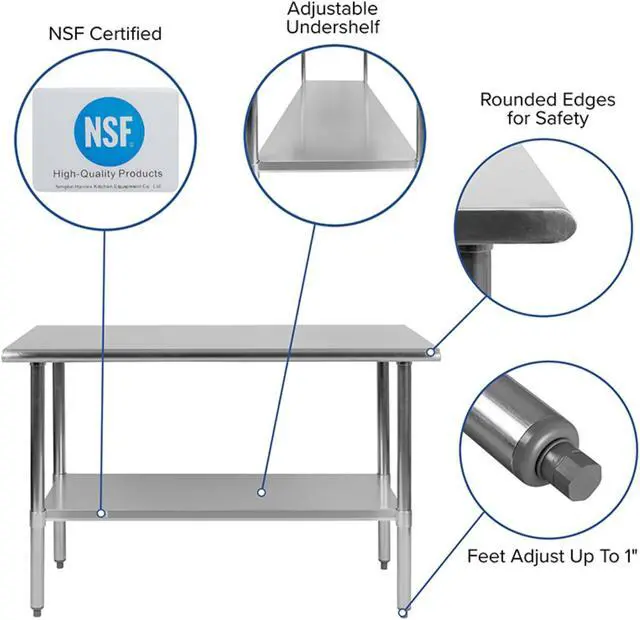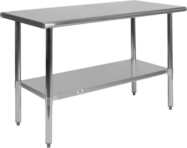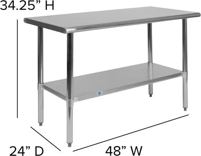 Give yourself some extra space for catering parties or setting up the buffet line at your eatery or bistro and increase functionality in your busy restaurant kitchen with this commercial kitchen prep and work table with adjustable undershelf. This steel commercial work table is a great space for bulk food preparation for businesses such as daycares, hotels and restaurants. This versatile steel table can be placed against a wall or used as a freestanding kitchen island. Strength and durability are important factors when choosing equipment. Made from quality stainless steel, this metal utility table resists corrosion and holds up to 600 lbs. weight capacity while the undershelf holds up to 200 lbs. This commercial grade work table is certified to NSF quality standards reducing the chance of foodborne illness. Not only for kitchen use, this stainless prep table can be used in an outdoor kitchen away from the elements on a covered patio or deck, as a planting station in your greenhouse or a work surface in your garage. Rounded corners prevent scrapes and cuts and this multi-use work table easily assembles in under 10 minutes with the included tools. Adjustable feet move up to 1" to keep you level on uneven flooring. Remove any traces of food contaminants with water and a neutral detergent followed by a dry cloth to keep this shiny piece looking new.Product Dimension-48"W x 24"D x 34.5"H