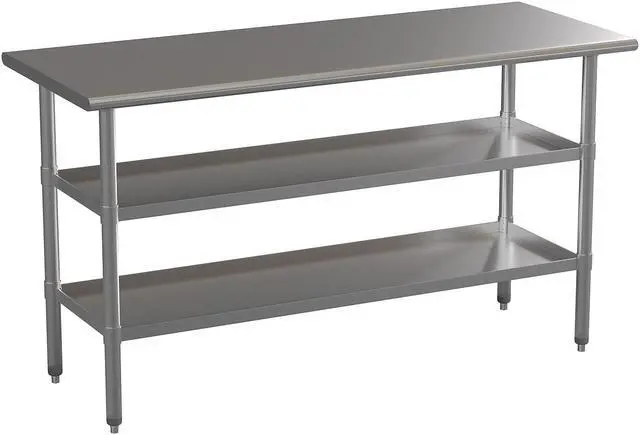 Kitchen space is always at a premium so this commercial stainless steel work table with dual adjustable undershelves is an excellent solution. Great for bulk food preparation for businesses such as daycares, hotels and restaurants, this versatile steel table can be placed against a wall or used as a freestanding kitchen island. Strength and durability are important factors when choosing equipment. Made from quality stainless steel, this metal utility table resists corrosion and holds up to 600 lbs. weight capacity while the undershelves hold up to 200 lbs. each. This commercial grade work table is certified to NSF quality standards reducing the chance of foodborne illness. Not only for kitchen use, this stainless prep table can be used in an outdoor kitchen away from the elements on a covered patio or deck, as a planting station in your greenhouse or a work surface in your garage. Rounded corners prevent scrapes and cuts and this multi-use work table easily assembles in under 10 minutes with the included tools. Adjustable feet move up to 1" to keep you level on uneven flooring. Remove any traces of food contaminants with water and a neutral detergent followed by a dry cloth to keep this shiny piece looking new. Commercial Stainless Steel Kitchen Prep Table with Dual Adjustable Undershelves. NSF Certified Stainless Steel. 600 Pound Weight Capacity 18 Gauge Steel Table, Undershelves hold up to 200 pounds. Rounded Corners prevent accidental injuries. Adjustable Feet are movable up to 1" to maintain a level work surface. Cleans Easily with Water and a Neutral Detergent Followed by a Dry Cloth. Assembles Easily in 10 Minutes or Less. Stainless steel work table for your industrial kitchen island, weekly food prep, laundry folding or extra pantry.