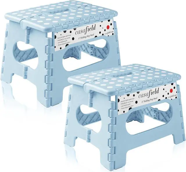 Never struggle again with out-of-reach items with these lightweight yet sturdy folding step stools from Casafield. These convenient, easily portable stools easily open with the flip of only one hand, each providing 9 inches of height when needed. Designed with safety in mind, these stools feature a textured, grip-dot, non-slip step surface for secure and safe use, as well as anti-skid footpads. Safety certified, these stools are perfect for everyone, including kids. Take these stools with you, the stools feature convenient handles allowing you to easily transport them from room to room, or on-the-go.