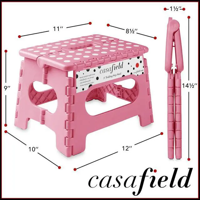 Never struggle again with out-of-reach items with these lightweight yet sturdy folding step stools from Casafield. These convenient, easily portable stools easily open with the flip of only one hand, each providing 9 inches of height when needed. Designed with safety in mind, these stools feature a textured, grip-dot, non-slip step surface for secure and safe use, as well as anti-skid footpads. Safety certified, these stools are perfect for everyone, including kids. Take these stools with you, the stools feature convenient handles allowing you to easily transport them from room to room, or on-the-go.