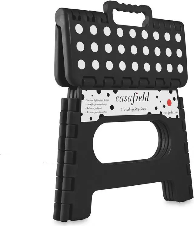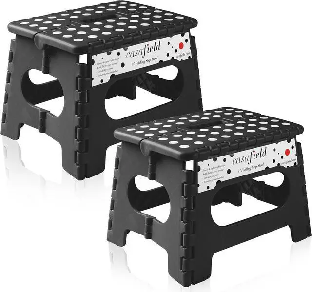 Never struggle again with out-of-reach items with these lightweight yet sturdy folding step stools from Casafield. These convenient, easily portable stools easily open with the flip of only one hand, each providing 9 inches of height when needed. Designed with safety in mind, these stools feature a textured, grip-dot, non-slip step surface for secure and safe use, as well as anti-skid footpads. Safety certified, these stools are perfect for everyone, including kids. Take these stools with you, the stools feature convenient handles allowing you to easily transport them from room to room, or on-the-go.