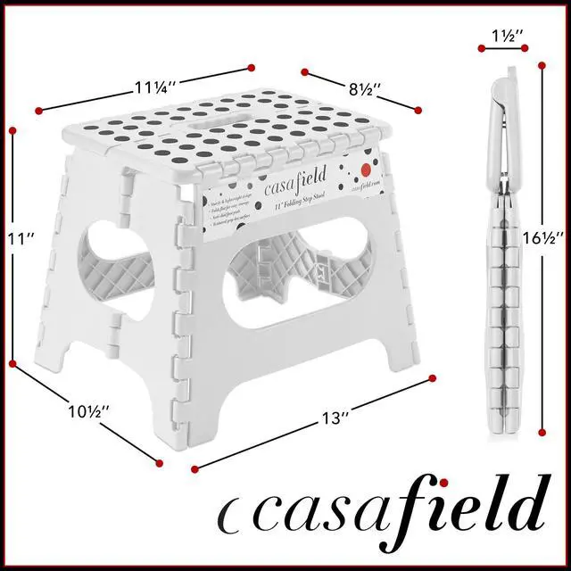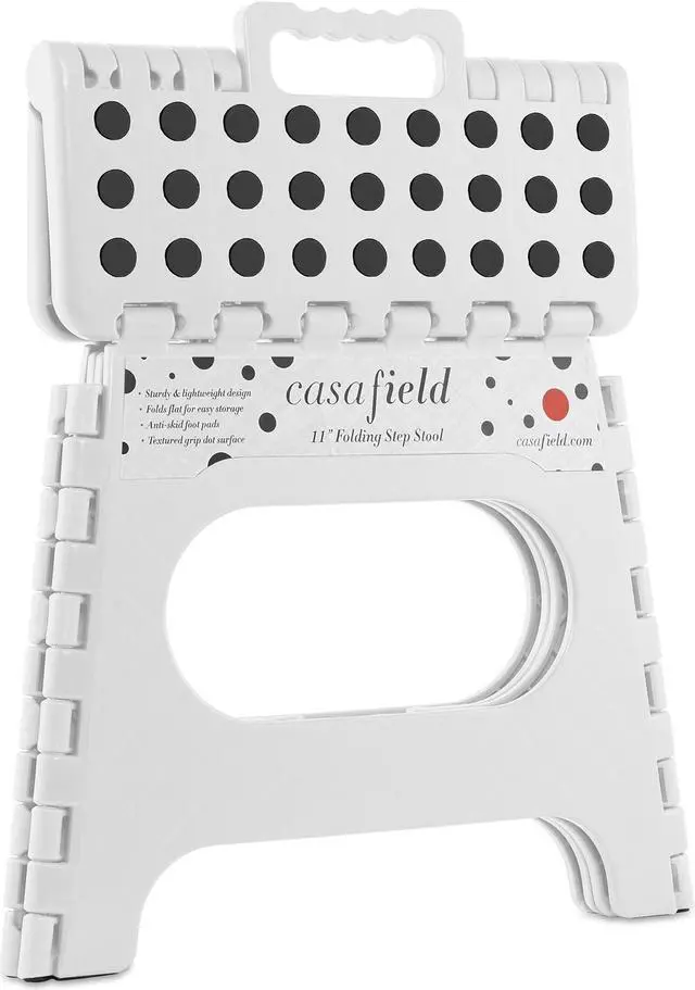 Never struggle again with out-of-reach items with this lightweight yet sturdy folding step stool from Casafield. This convenient, easily portable stool easily opens with the flip of only one hand, providing 11 inches of height when needed. Designed with safety in mind, this stool features a textured, grip-dot, no-slip step surface for secure and safe use, as well as anti-skid foot-pads. Safety certified, this stool is perfect for everyone, including kids. Take this stool with you, the convenient handle allows you to easily transport it from room to room, or on-the-go.
