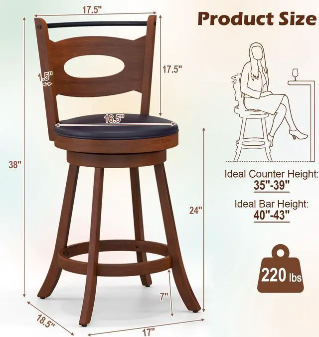 Product Size and Easy Cleaning: Each bar chair is 18.5" x 17.5" x 38"(L x W x H). Its seat height is 24", which fits 35"-39" counters.(24 inches)/Each bar chair is 19" x 17.5" x 43.5"(L x W x H). Its seat height is 29", which fits 40"-43" dining tables(30 inches). In addition, the PVC cushioned seat can be easily wiped clean with a soft cloth.