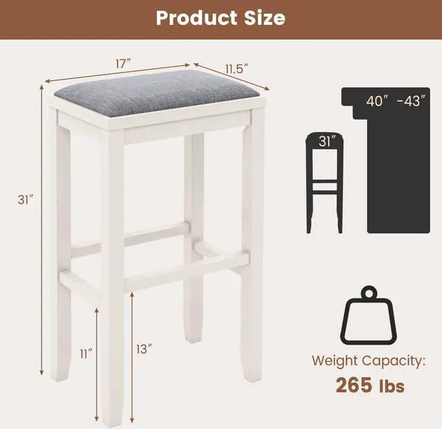 Solid Rubber Wood Frame: The bar stool set is a firm and well-made piece, which can support up to 265 lbs. What's more, solid rubber wood frame means higher hardness, unique texture and excellent durability, playing an important role in the stability of the bar stools as well.