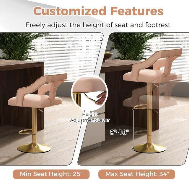 Adjustable Height: With an SGS gas rod, each bar stool provides the 25"-34" adjustable seat height that allows you to easily find the perfect sitting position, while the comfortable footrest ensures additional support and relaxation.