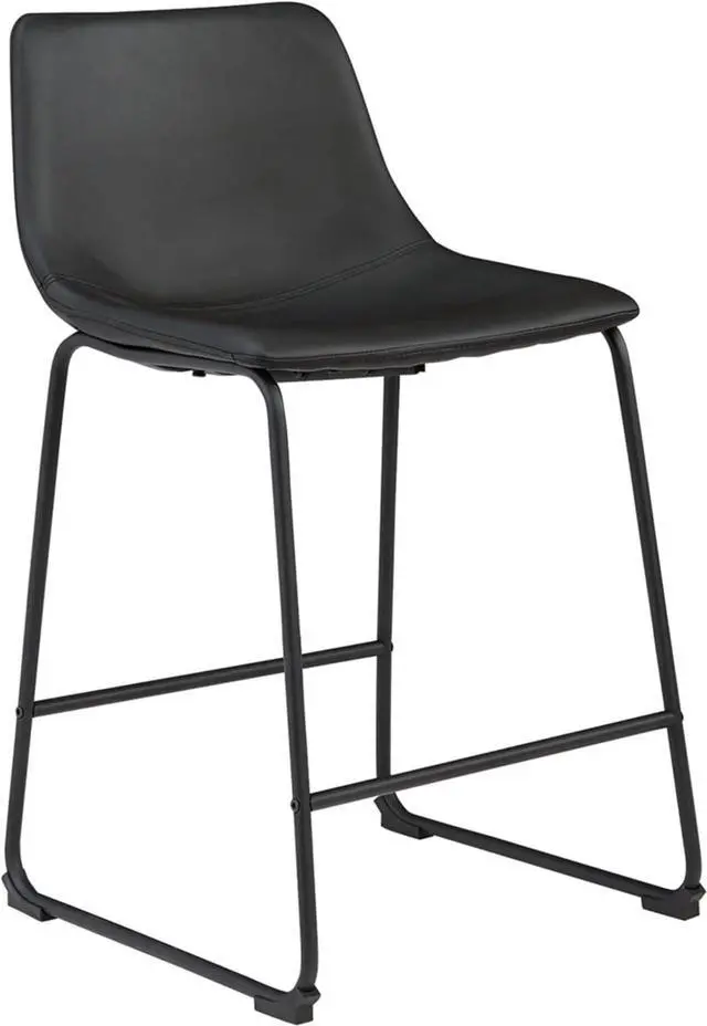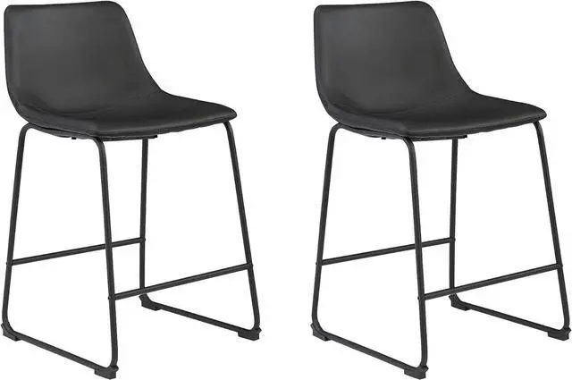 MID-CENTURY INSPIRED: These counter-height bar stools, with bucket seats upholstered in black faux leather upholstery and tubular metal bases with a black finish, have a charmingly vintage tone