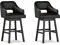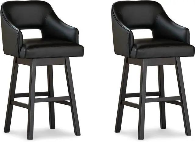 CASUAL CONTEMPORARY: A cutout in the back is paired with a contoured design, while black upholstery and a dark brown finish on the chair legs allows these stools to blend with existing decor