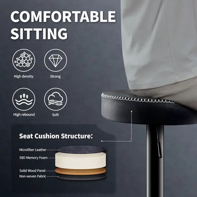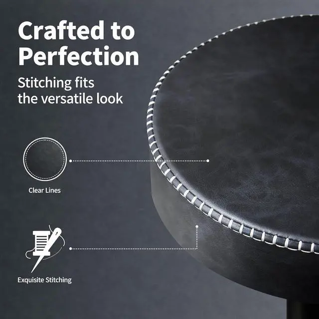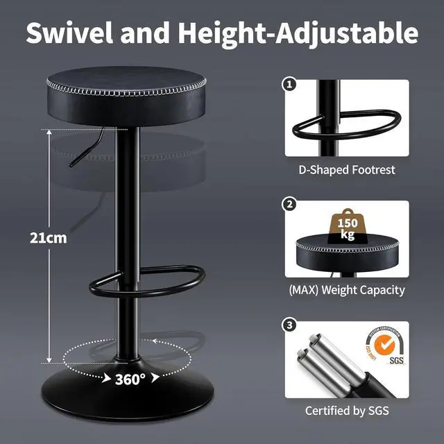 360° Swivel & Adjustable Height: The bar stools offer 360-degree rotation for easy turning and adjustable seat height from 25.7 " to 33.6 " using the lift lever. The backless design makes storage under counters or tables simple and space-efficient.