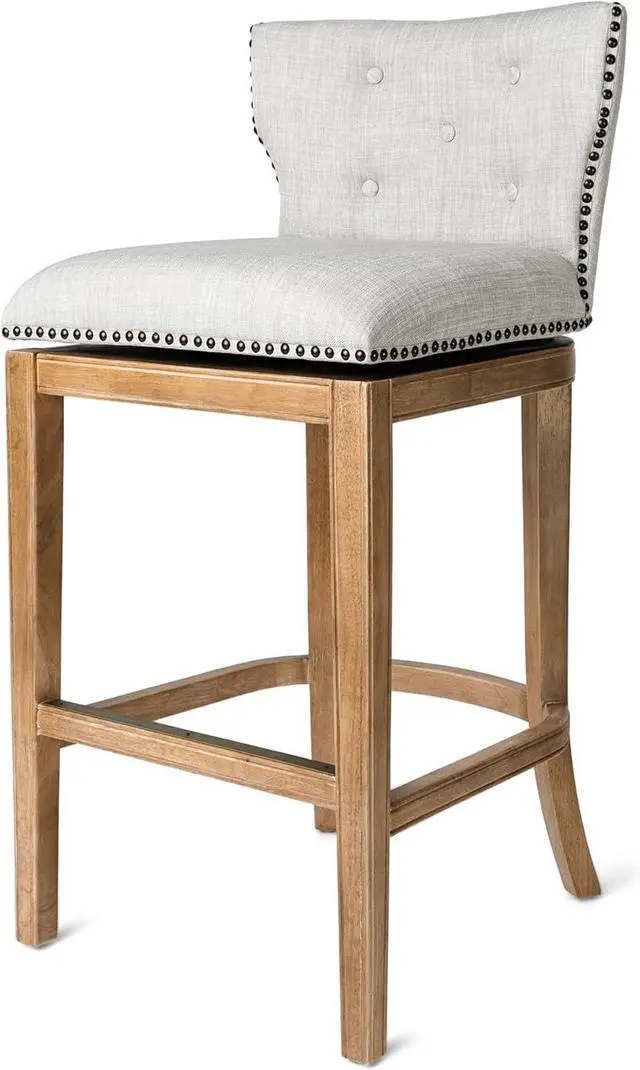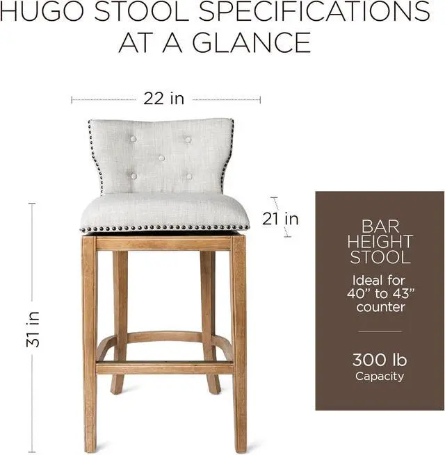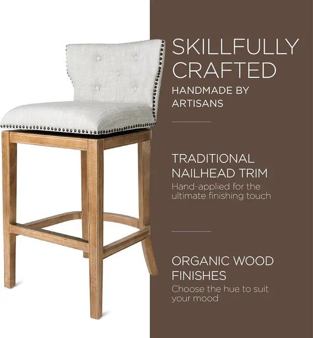 TUFTED TO PERFECTION: Our well-made Hugo Stool with back is a classic choice with its wide, wingback silhouette and button-tufted upholstery. Our kitchen stools with swivels are hand-crafted with impeccable attention to detailfrom the nailhead trim to the wood-carved base.