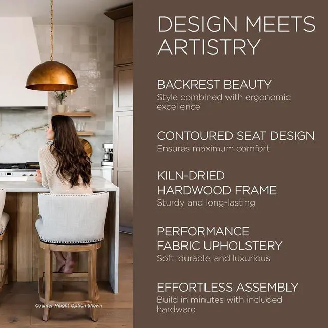 PREMIUM UPHOLSTERY: These elegant fabric kitchen swivel bar stools lend the luxe, comfortable feel youve been craving in your home dining space or breakfast countertop. You and your loved ones will appreciate the posh seating, high-density padded foam cushion, and exceptional fabric upholstery.
