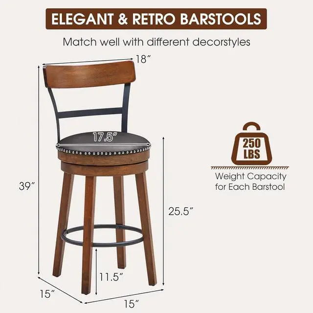 Elegant AppearanceThese swivel barstools seamlessly harmonize with any interior aesthetic, making them an ideal fit for various decor styles. Perfectly tailored for counter-height tables like kitchen islands, work tables, and home bars, these stools transcend conventional seating to bring an air of sophistication to your space.