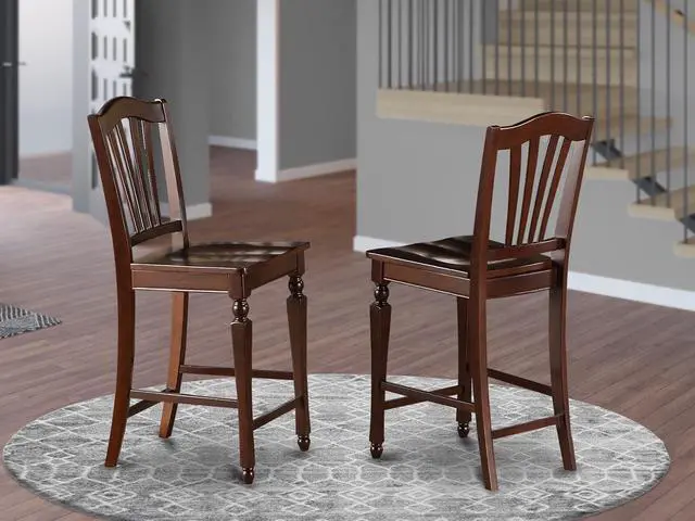 KITCHEN CHAIR SEAT MATERIAL: This complemented by a comfortable wooden seat and a mahogany back and high legs that offer a modern aesthetic to your dining room. These contemporary counter height chairs also provide superb back support and an exceptional sitting experience. This cutting-edge innovation showcases a substantial hardwood frame that provides remarkable stability,