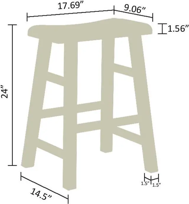 Overall size measures at 17.69 inches width, 14.5 inches depth and 24 inches in height, the seat measures 9.06 inches in depth, 17.69 in width and 1.56 in height, the leg measures at 1.5 inches depth by 1.5 inches width