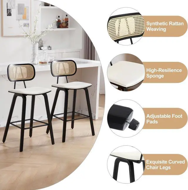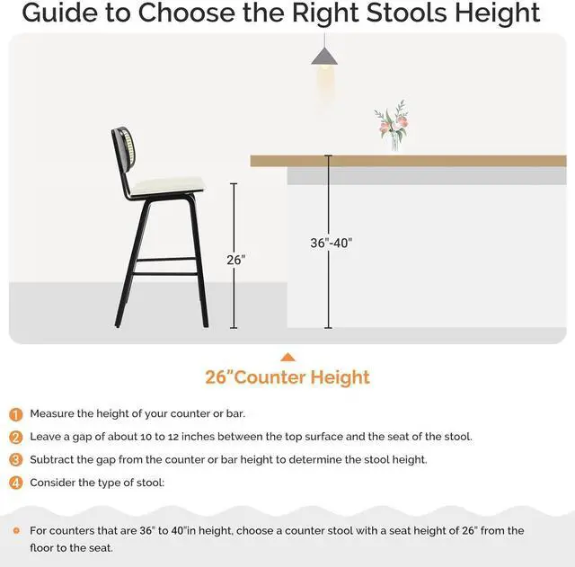 Versatile to UseThese rattan counter stool have a height of 26 inches from seat to floor, ideal for countertop that are 36 to 40 inches tall. You can easily tuck them under any counter or table so they don' t take up too much space when not in use. Our faux leather bar stools can be used as a stylish modern decoration for dining room, living room, home bar, bar table, kitchen peninsula or island, home bar, kitchen countertop, dining room, etc. Easy assembly with installation instructions.