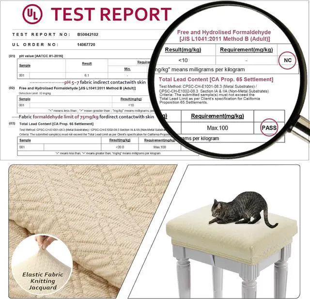 • Product Details UL Test Report NO.B50842102. Rhombic jacquard design. Stretchy Fabric with good crease-resistant. The elastic band helps stay on the seat. Machine washable. pH value:6.1; Free and Hydrolised Formaldehyde<10mg/ kg; Total Lead Content<20mg/ kg. Comply with national standards.
