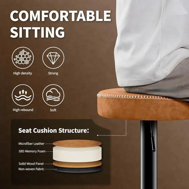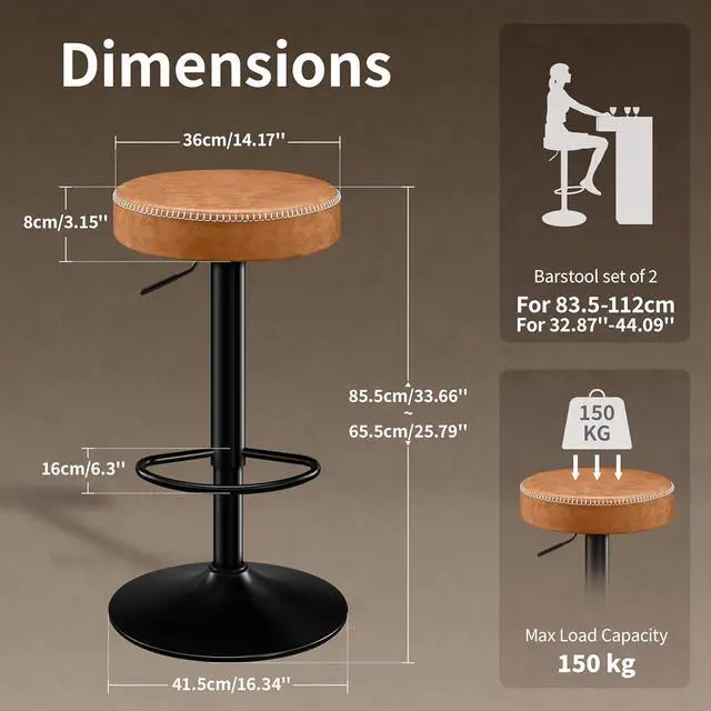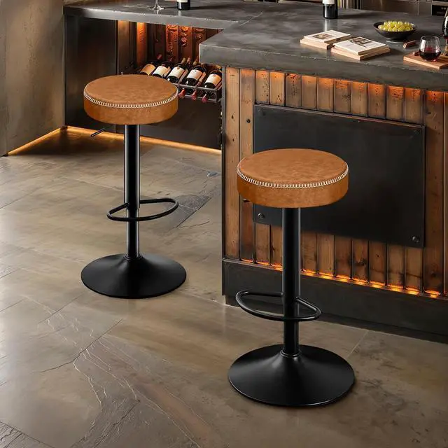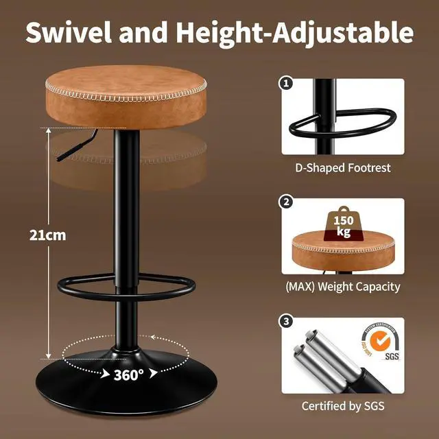 360° Swivel & Adjustable Height: The bar stools offer 360-degree rotation for easy turning and adjustable seat height from 25.7 " to 33.6 " using the lift lever. The backless design makes storage under counters or tables simple and space-efficient.