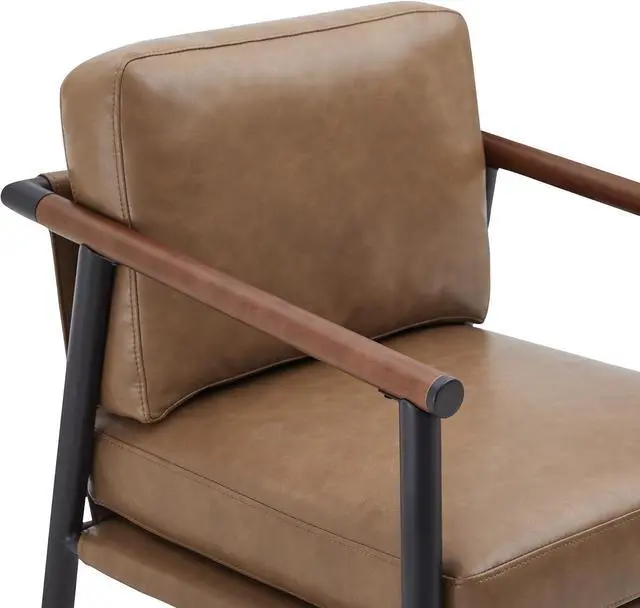 Mid-Century Modern Barstool: This barstool blends a sleek metal frame with a sling-style seat, embodying a minimalist yet rustic mid-century style. Straightforward square footrest warm-toned wooden armrests and thick soft cushions provide exceptional comfort and lasting durability.