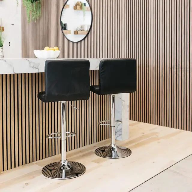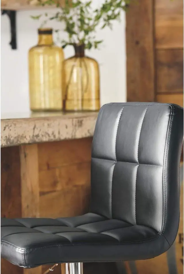 HANDSOMELY CRAFTED: Cushioned seats are upholstered in faux leather, and adorned with a weighted chrome-tone metal base. Barstools are adjustable from counter to pub height for added convenience