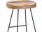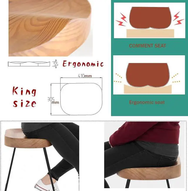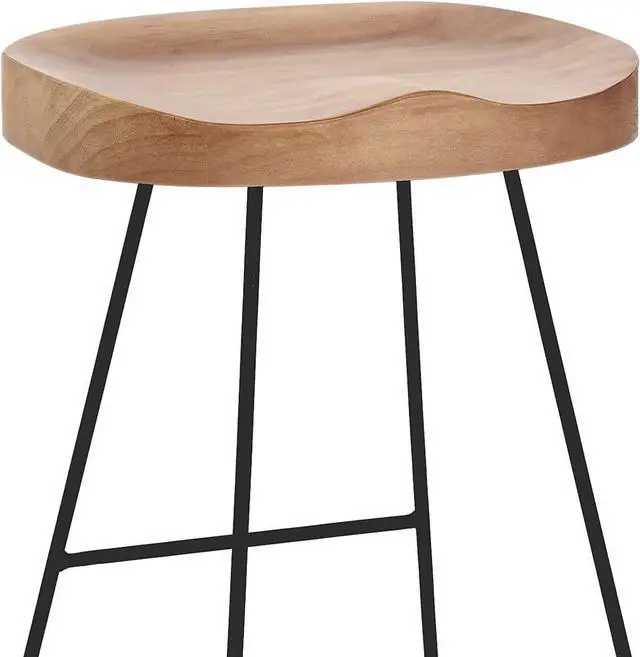 Design: A modern stool with a minimalist design. The seat is made of solid pine wood, with a natural finish and has a rounded, contoured shape for comfort. The base is made of metal with a geometric wireframe design, giving it a sleek and contemporary look. The stool has a simple yet stylish aesthetic that can blend with various interior designs.